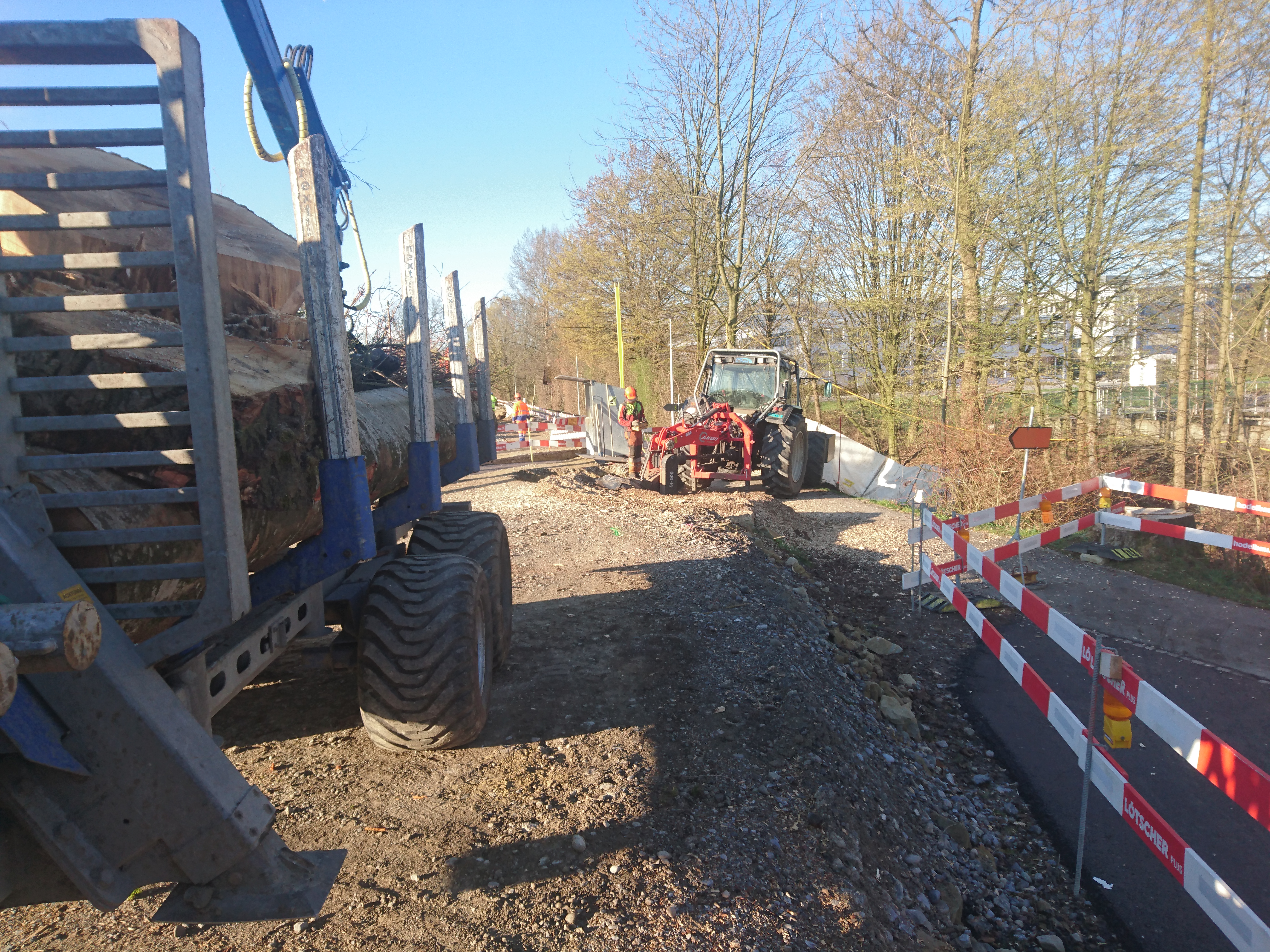 Für das erstellen einer neuen Wasserleitung in Steinhausen mussten zwei grosse Wurzelstöcke entfernt werden. Vorgängig wurden die Stöcke bodennah abgesägt, so dass wenig Fräsmaterial anfällt. Weiter wurde entlang des Baches mit Brettern und Folien eine Schutzwand erstellt, um zu vermeiden, dass Fräsmaterial in den Bach gelangt und abgeschwemmt wird. Die Wurzelstöcke wurden mit einer grossen Stockfräse, die mit einem Traktor betrieben wird, ausgefräst.