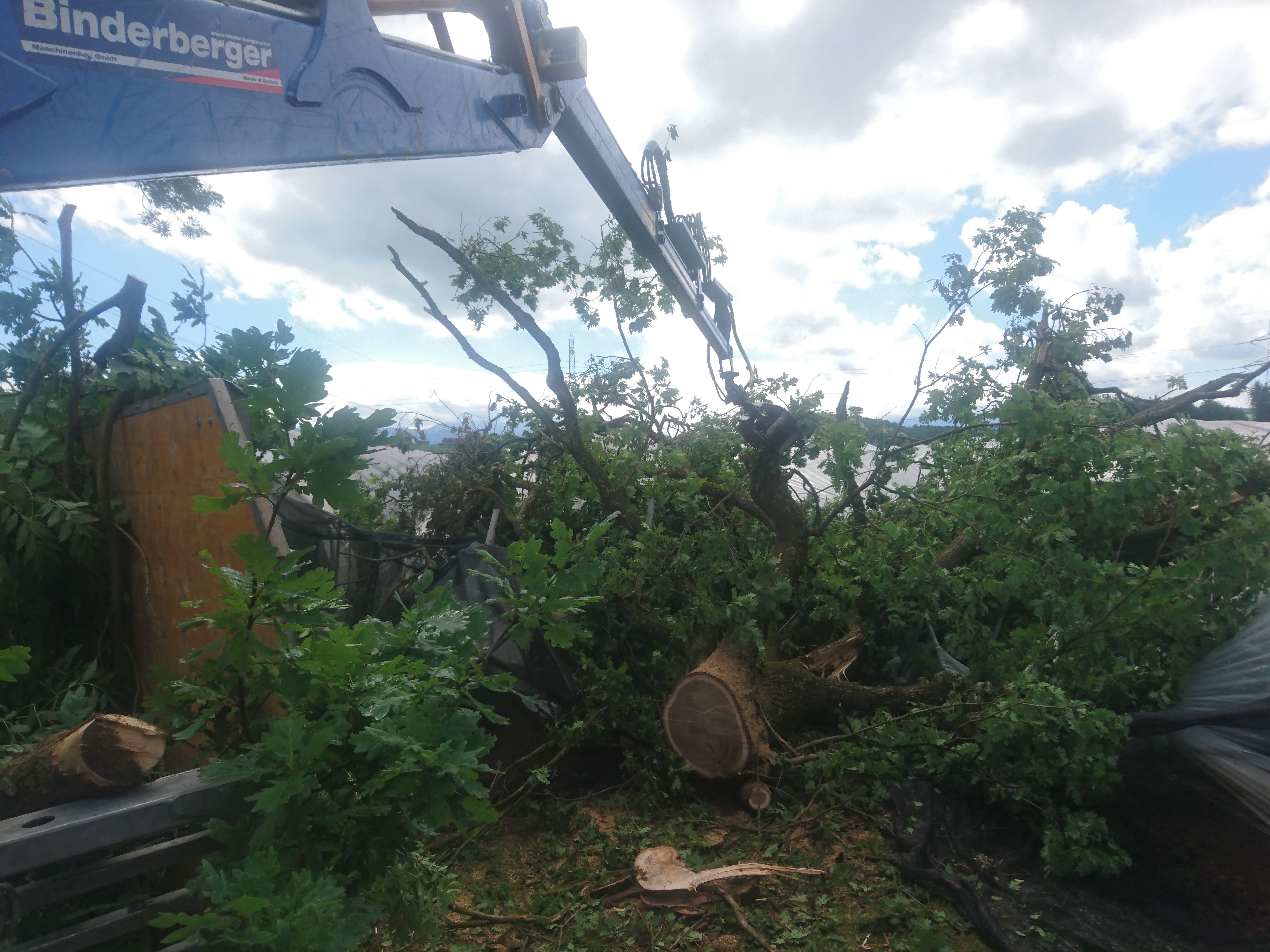Ein heftiger Sturm wirft mehrere sehr grosse Eichen auf Gewächshäuser. Die Amhof Forst GmbH wurde beauftragt, die Bäume möglichst schonend zu räumen, so dass die Gewächshäuser nicht zusätzlichen schaden nehmen. Als erstes musste die Zufahrt zwischen Bestockung und Gewächshäuser geräumt werden. Bevor die Baumkronen auf den Gewächshäuser entfernt werden konnten. Zum öffnen wurde ein Traktor mit einem Frontlader an dem eine Holzzange angebaut ist eingesetzt. Die zum Teil weit über ein Meter dicken Eichenstämme wurden mit einer Seilwinde zum Lagerplatz gebracht. Das Kronenmaterial wurde mit dem Kran des Forstanhängers in Stücken ab den Gewächshäuser gehoben und auch zum Lagerplatz gebracht. Die Arbeiten konnten ohne Zwischenfall und zur Zufriedenheit des Auftragsgäbe abgeschlossen werden.